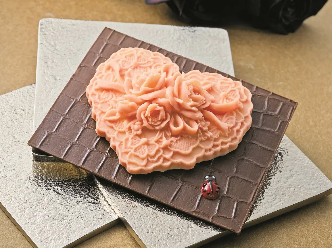 ホワイトチョコレートをピンクに色づけした華やかな彫刻ショコラに、ベースのビターチョコはトレードマークのクロコダイル模様を施しています。