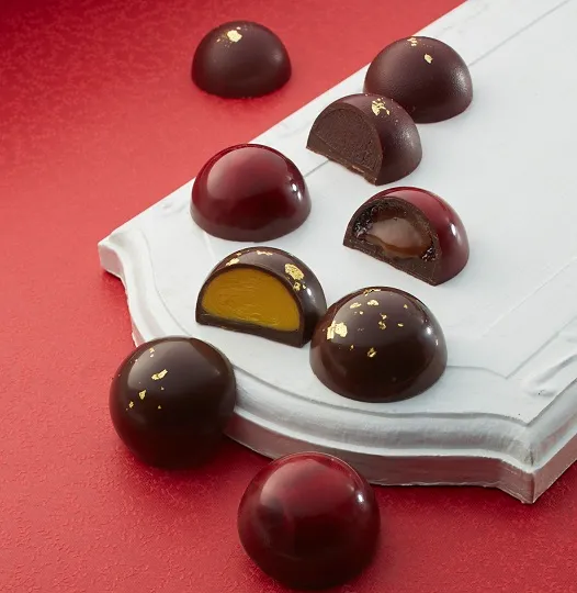 辛口の白ワインを洋梨のジュレとダークチョコレートのガナッシュに閉じ込め、さわやかな味わいを実現。