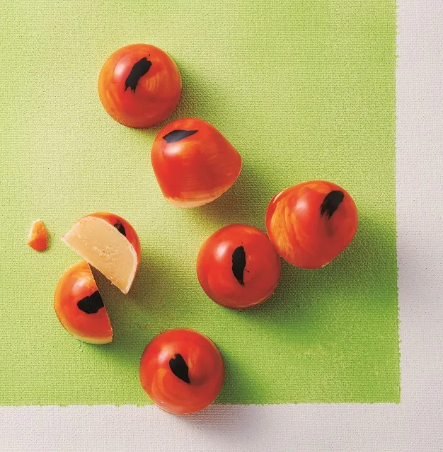 ブラッドオレンジピューレのクリームガナッシュを、ホワイトチョコでカバーし、ハンドペインティング。