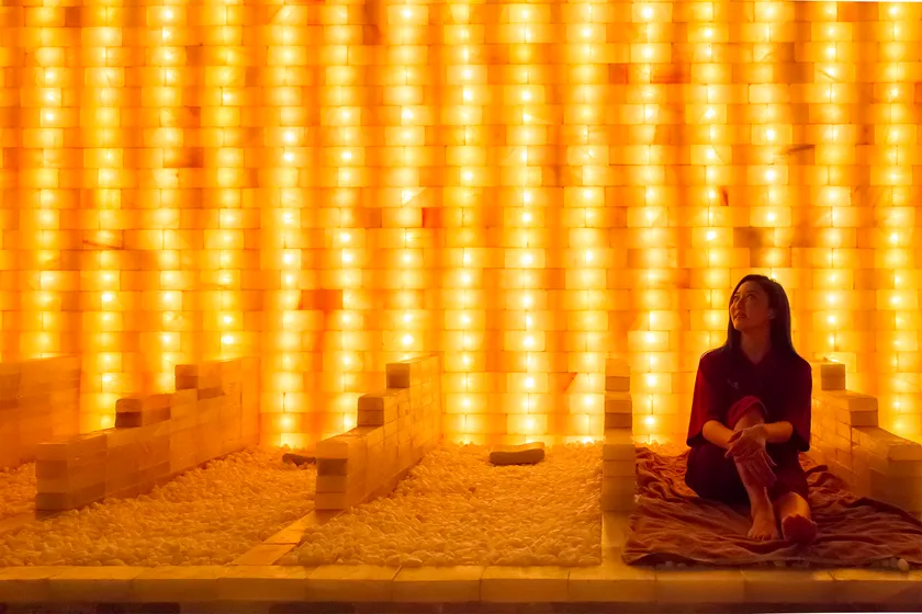 (6) 今年人気ドラマのロケ地で話題になったアロマ岩塩房は、ヒマラヤの天然岩塩を床・壁に使用し、カラーテラピーとアロマテラピー効果がある岩盤浴。