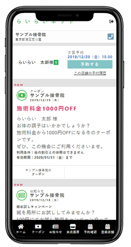 ・店舗からの情報(クーポン、お知らせ、来店後メッセージ、施術写真)がSNSのようなタイムラインで表示されます。