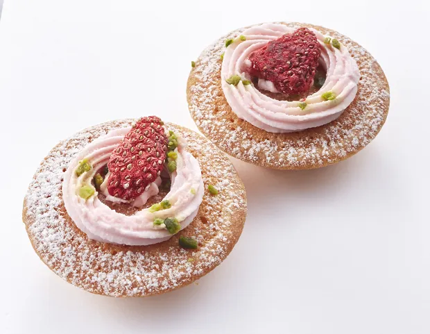 甘酸っぱいドライいちごに、いちごクリームを合わせ、ピスタチオを散りばめた一口タルト。