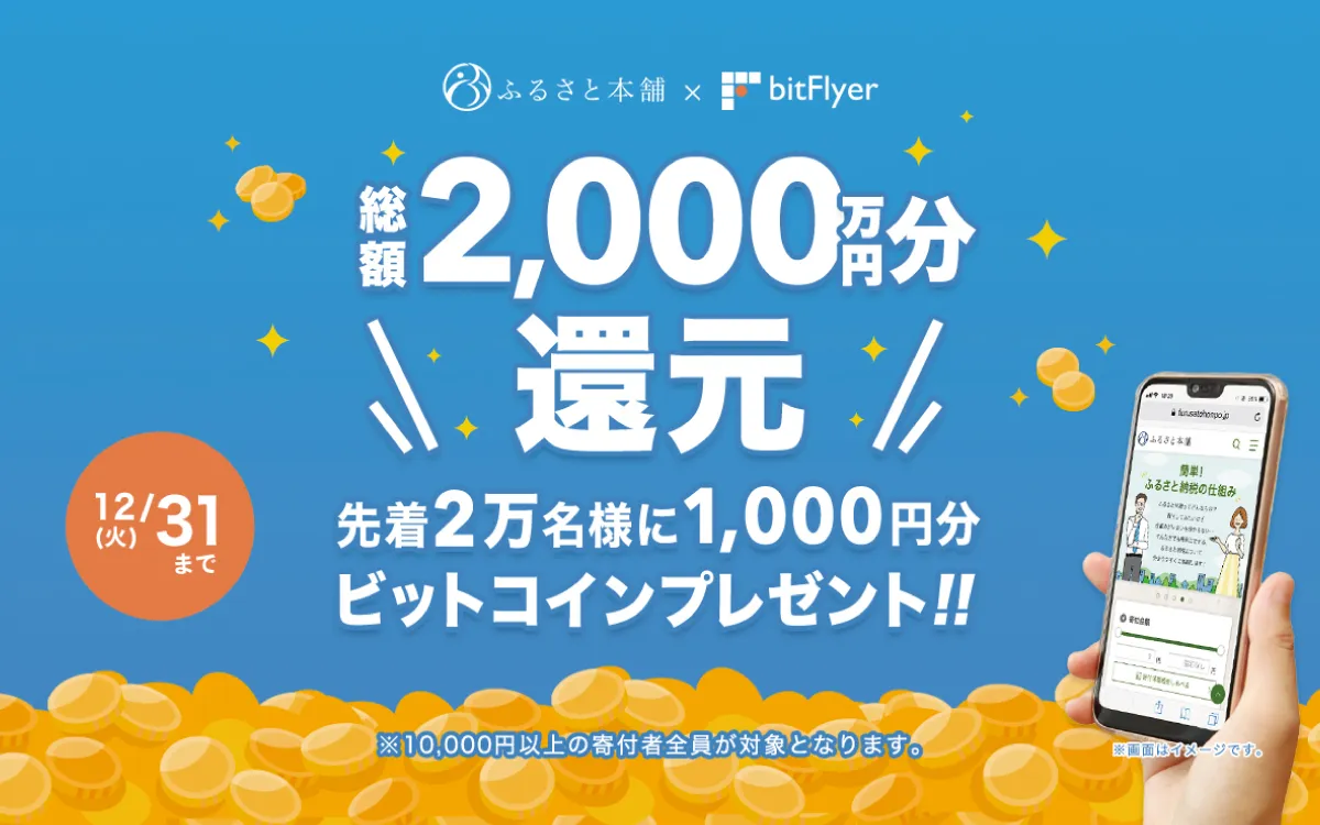 ・内容:期間中「ふるさと本舗」にて、10,000円以上ご利用した方、先着2万名様に、1,000円分のビットコインをプレゼントいたします。