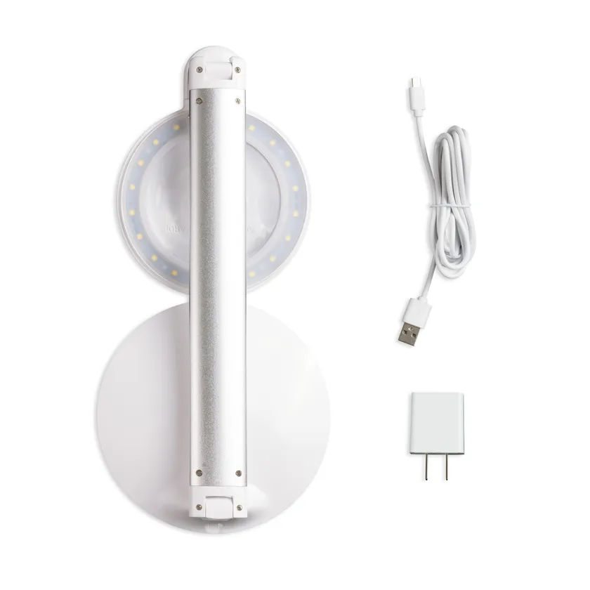 「Halo」は太陽光に近い自然な光なので、太陽の下で見るような本来の色で見ることができ、なおかつ長時間使用しても目が疲れにくく、消費電力はわずか5Wという特長を持っています。また、拡大鏡は拡大率2.25倍の直径9cm大型レンズに、拡大率4.0倍の小型レンズが埋め込まれており、目的に応じて倍率を使い分けることができます。両手を自由に使いながら手元を拡大でき、上下、左右の角度をそれぞれ180度調節することもできますので、刺しゅうやネイルアートのような細かい作業にも最適です。