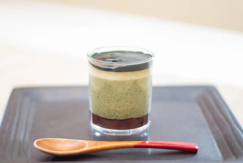 4層に仕立て上げた和風のムースです。上から順に、よもぎのジュレ、あずきのムース、よもぎのムース、あずきのゼリーです。まろやかな甘みのあるムースとゼリーに、苦みのあるよもぎのジュレが良いアクセントになっています。食感の異なる4つの素材が絶妙なふんわり感となめらかな口溶けを演出し、あっという間に食べてしまう美味しさです。