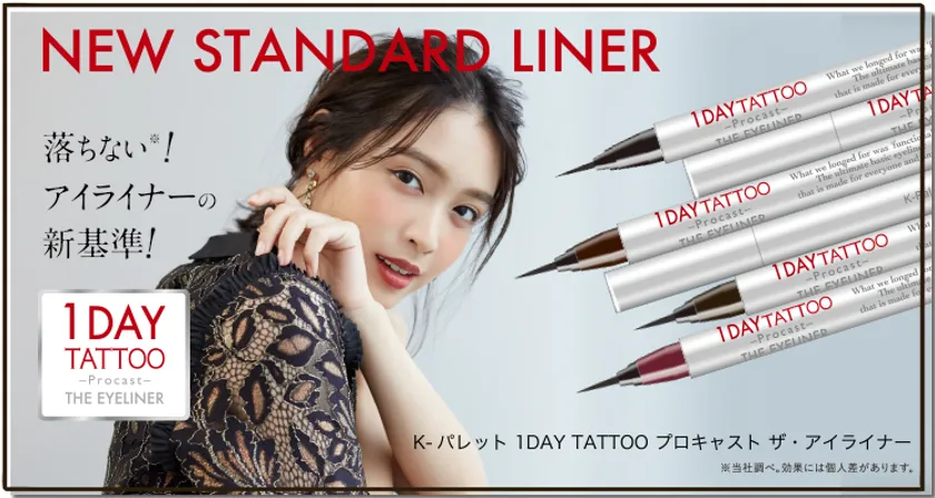 基本的な機能をとことん追求した新ライン『1DAY TATTOO -Procast(プロキャスト)-』から、上質なアイライナー「K-パレット 1DAY TATTOO プロキャスト ザ・アイライナー」が新登場です。新処方「TATTOO FILM INK(タトゥーフィルムインク)」採用で、かすれ・色むらのない美発色・高発色ラインを1日キープします。さらに、極上筆の新法則「1:290の法則」により、繊細なフィニッシュラインと安定した描き心地を実現しました。「落ちにくいコスメ」のその先を追求した、落ちにくさと美しさを兼ね備えた一歩先ゆく新アイライナーです。