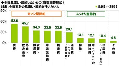 今後家計の見直し・節約を行いたい人(289名)に、今後見直し・節約したいものを聞いたところ、「食費」(52.6%)が最も高く、次いで「外食・飲み会費」(45.7%)、「衣類・雑貨費」(34.3%)、「水道光熱費」「娯楽費」(いずれも33.6%)となりました。“ガマン型節約”の意向が高いようです。