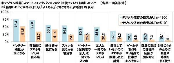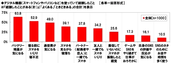 『経験したことがある(計)』(「よくある」「ときどきある」の合計、以下同じ)と回答した人の割合をみると、「バッテリー残量が気になる」は63.8%、「寝る前にスマホをいじり寝不足」は52.9%、「通信費が気になる」は49.0%、「スマホを見ながら寝落ち」は39.1%、「パートナー(配偶者や恋人)と一緒でもスマホいじり」は37.8%となりました。