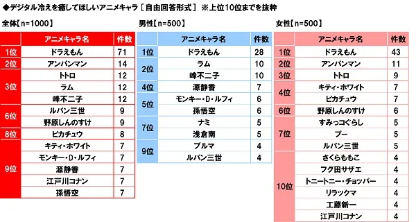 男女別にみると、男性回答では1位「ドラえもん(ドラえもん)」、2位「ラム(うる星やつら)」「峰不二子(ルパン三世)」、女性回答では1位「ドラえもん(ドラえもん)」、2位「アンパンマン(それいけ!アンパンマン)」、3位「トトロ(となりのトトロ)」となりました。2位以下には、男性回答では魅力的な女性キャラ、女性回答では幅広い層から人気の癒し系キャラが挙げられる結果となりました。