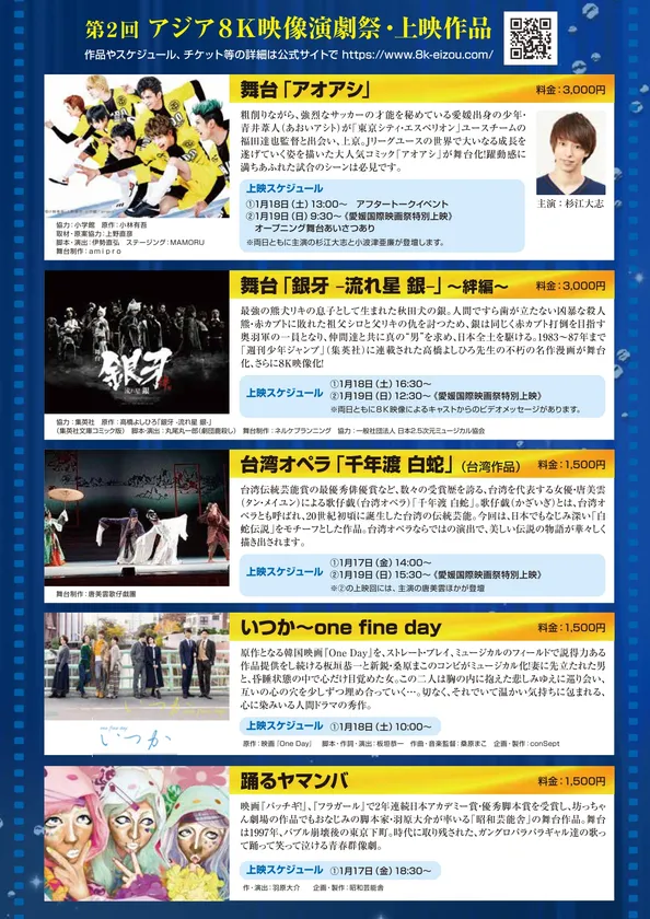 舞台「アオアシ」主演の杉江大志(「テニスの王子様」「刀剣乱舞」など)、小波津亜廉(「ハイキュー!!」「うたの☆プリンスさまっ♪」など)、台湾オペラの第一人者である唐美雲(タン・メイユン)ら、豪華出演キャストが来場してのトークイベントなども予定されているほか、1月19日には初開催となる「愛媛国際映画祭」ともコラボし、道後温泉で開催される同映画祭のレッドカーペットにも上記キャストが参加します。