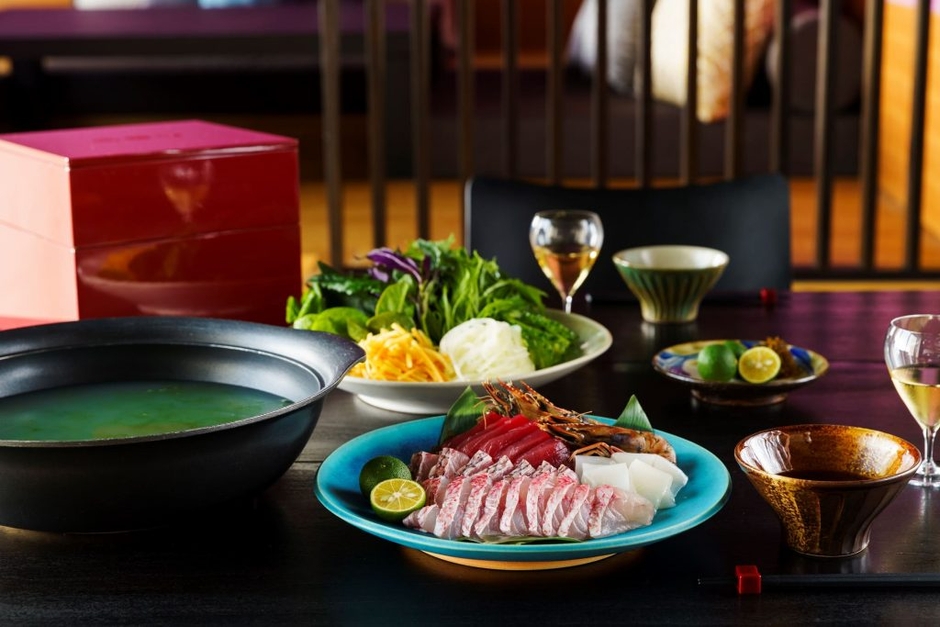 沖縄県産の水産物を使用した海鮮しゃぶしゃぶ鍋は、「星のや沖縄」と「星のや竹富島」の2施設で提供します。マグロやアカマチなどの魚や車えび、モズクを中心に、その日の水揚の様子を見ながら魚を選び、盛り合わせます。貝の出汁に泡盛を加えたスープにさっとくぐらせることで、魚介が持つ旨味が増すとともに、食感の良さを楽しむことができます。インルームダイニングのメニューとして客室へお届けするため、プライベート空間で時間を気にせずにゆっくりと堪能できます。