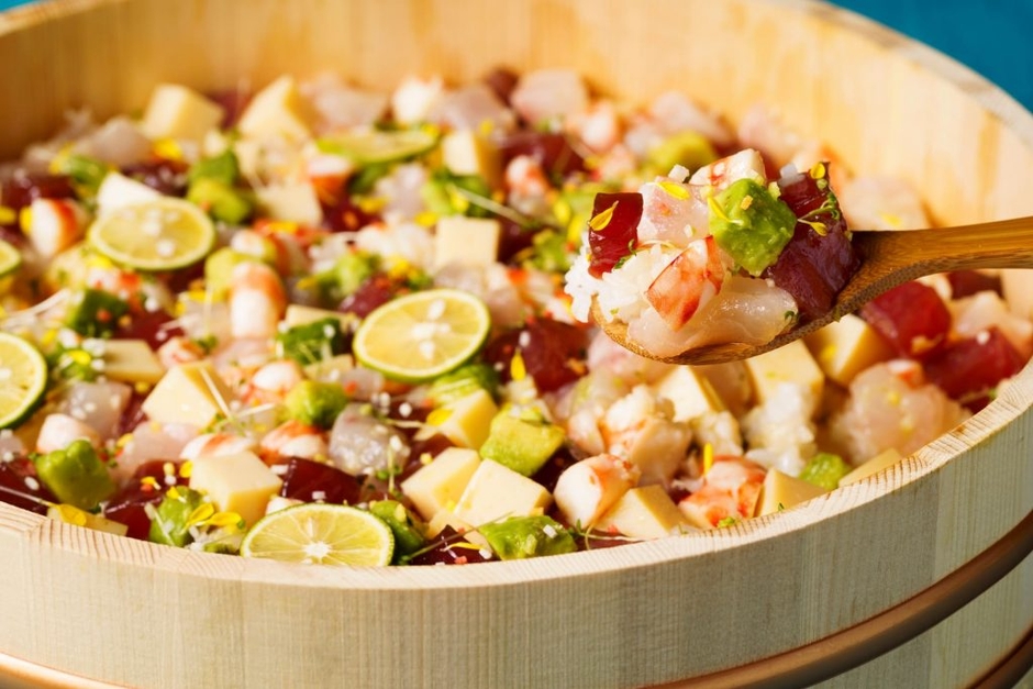 「リゾナーレ小浜島」と「西表島ホテル」の2施設では、色鮮やかな海鮮ちらし寿司をビュッフェレストランで提供します。白身魚はシークワーサーの果汁を使って締め、マグロは漬けにするなど、魚介に合わせて旨味を引き出す味付けを行っています。酢飯にもシークワーサーの酸味を効かせて、爽やかに仕上げました。