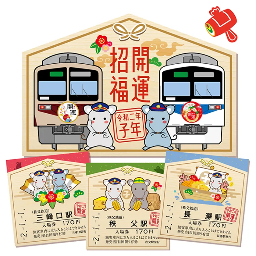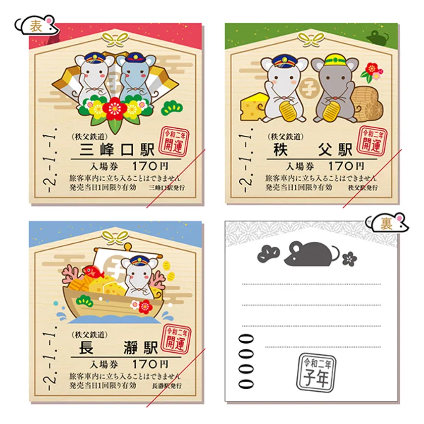 2020年干支の『子』をモチーフにした、カラー硬券入場券です。硬券の裏面には、お願い事が書けるようになっています。また、台紙は絵馬型になっており、表面には急行開運号のイラストがデザインされ、裏面には秩父三社のご紹介をしています。