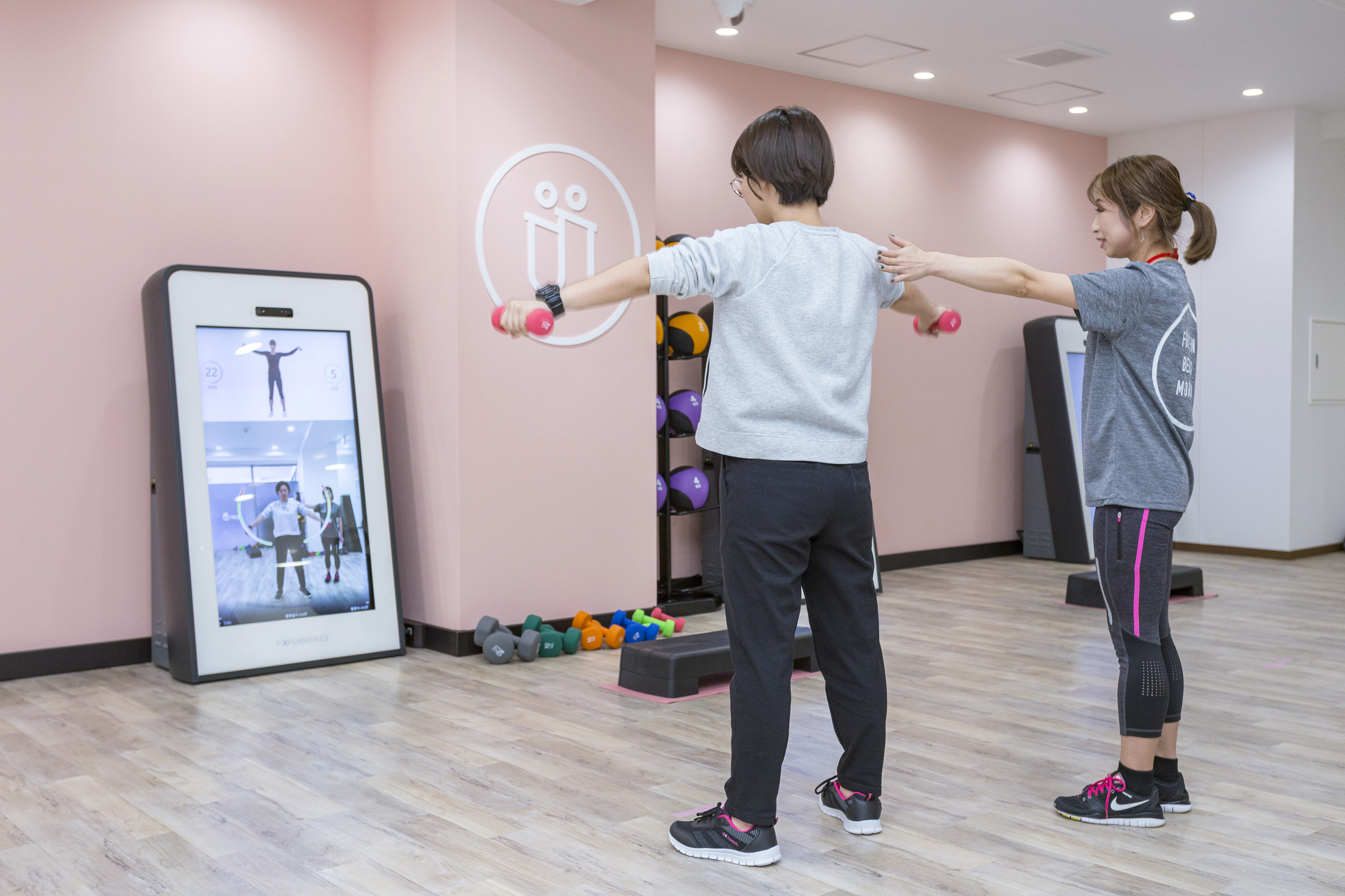 スタジオ内には、ダンベル・チューブ・ボールなどの器具が設置されています。トレーニングによって、多彩な器具を使用することで、利用者は飽きることなく楽しく続けられます。さらに、アプリを使って全世界のフィットネスパーソンたちとランキングを競い合えるなど、データフィットネスならではのサービスの拡充も予定しています。
