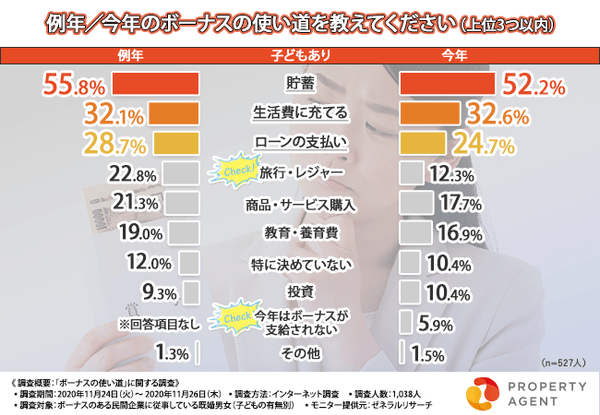 今年は新型コロナウイルスの影響もあり、ボーナスの使い道について慎重に考えている方も多くいらっしゃるかと思います。そこで今回、ボーナスのある民間企業に従事している既婚男女(子どもの有無別)を対象に、「ボーナスの使い道」に関する調査を実施しました。