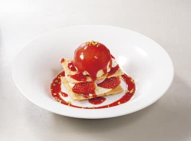 サクサク食感のパイで、苺クリームとふんわりなめらかなカスタード、フレッシュの苺をはさみ、甘酸っぱい苺ソースで覆ったバニラアイスを重ねました。