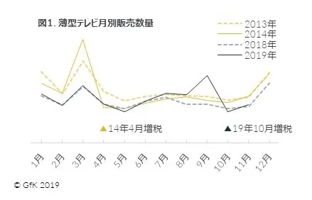 2019年1-11月の薄型テレビ販売は数量前年比10%増となった。エコポイント制度やアナログ停波による特需から10年近くが経過し、買い替え需要が高まっていると考えられる。