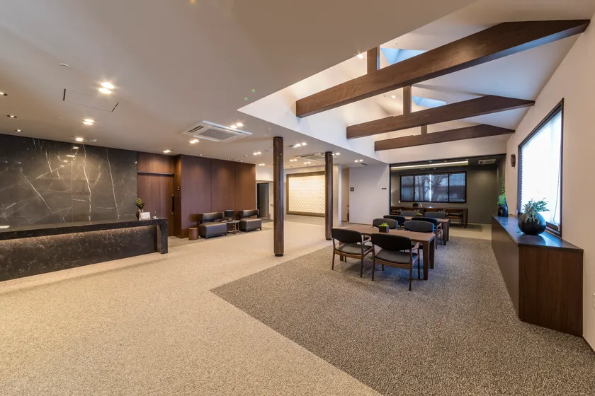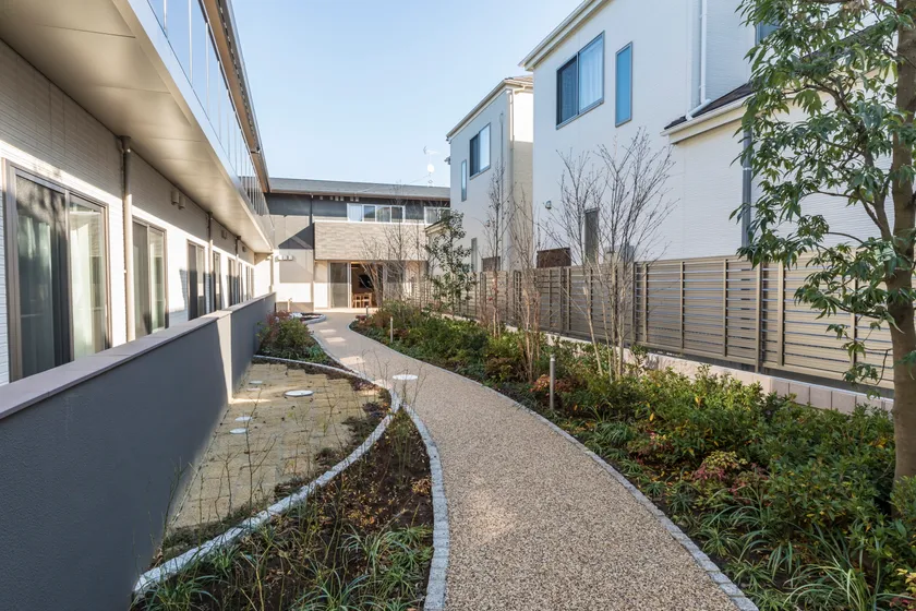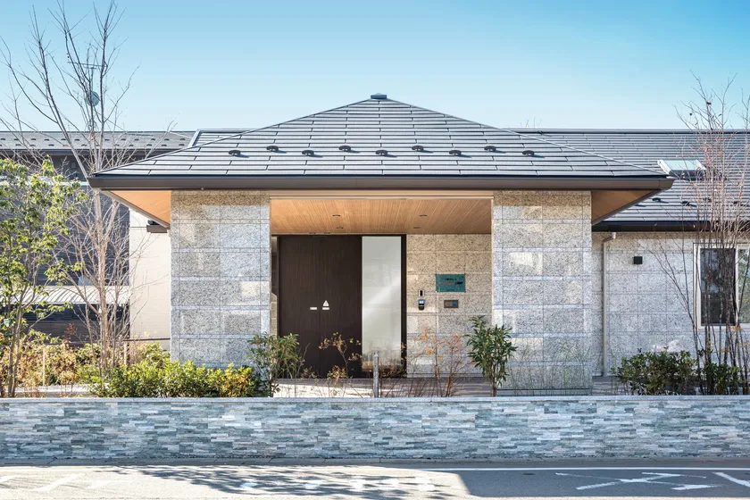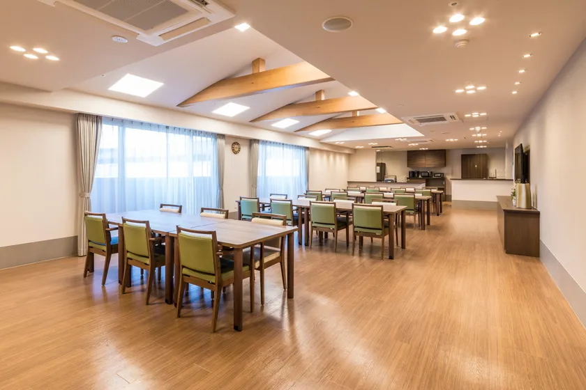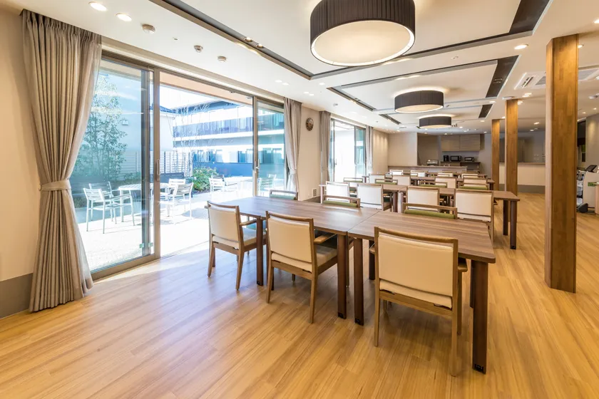 アズハイム上福岡では今回初めて、造園まで赴き、植木を一本一本選んでおります。一本の茎の根元から複数の茎が分かれて立ち上がっている「株立ち」を中心にセレクト。紅葉や桜など春夏秋冬楽しむことができます。設計・施工は積水ハウス。各セクションに担当が配置され、造り込みにこだわることができました。屋根の形状や高さにあえて変化をつけ、連続的な造りを演出。外観は黒・白・グレーをベースとし、「箱根の旅館」のような奥ゆかしく落ち着いたトーンに仕上げています。夜には、川沿いから旅館を見た時のような品のあるライトアップも魅力のひとつ。1階ダイニングは木造のような木のぬくもりがあり、2階ダイニングは天井を高くとり、開放感ある空間を演出しております。