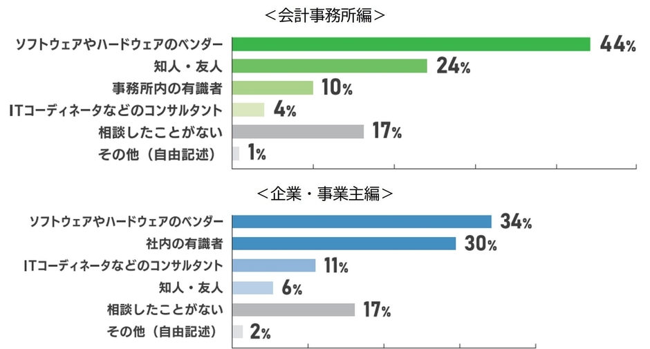 ・会計事務所で最も多かったのは「ソフトウェアやハードウェアのベンダー」で44%、「ITコーディネータなどのコンサルタント」といった専門家への相談は4%