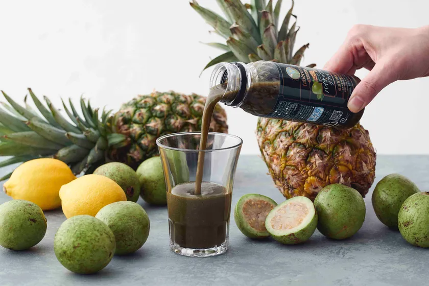 完熟パイナップルとグアバにスーパーフードの生スピルリナ「タベルモ」を加えた混合果実入り飲料です。
