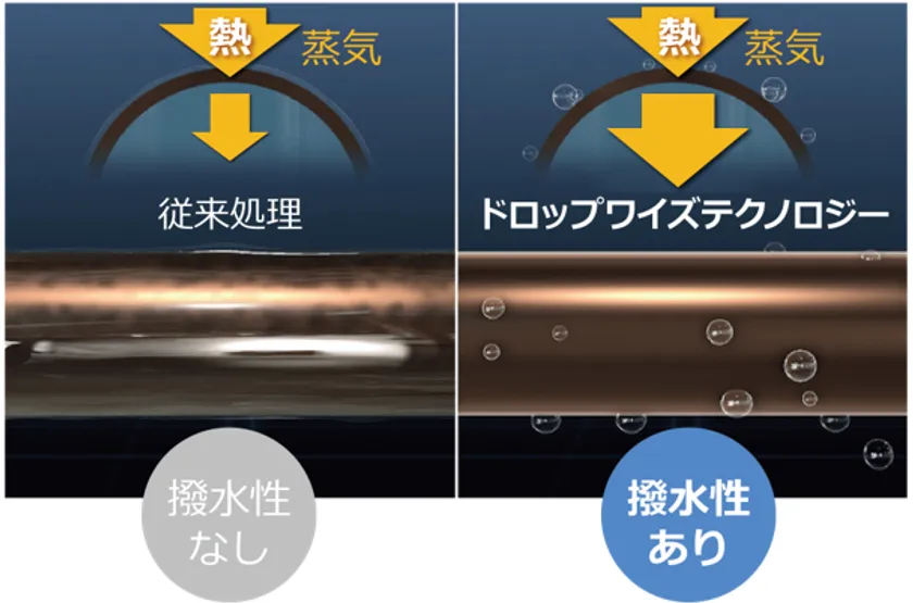 撥水性をもたせることで、蒸気の凝縮形態が膜状から滴状に変化するため、熱伝達率が向上します。