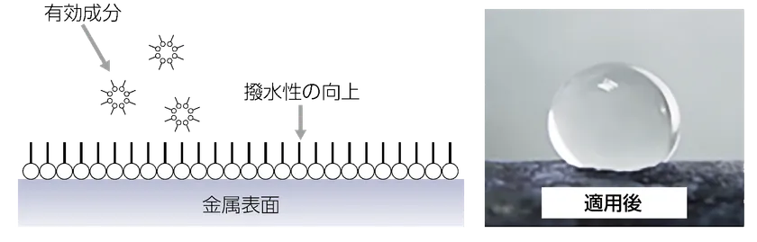 撥水機能を有した薬品中の成分が金属表面に吸着し、凝縮形態を膜状から滴状に変化させます。