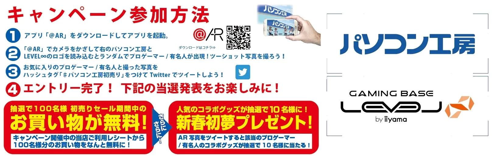 元旦からの新企画!スマホから「@AR」アプリで「指定のロゴ」を読み取ると、ゲーミングPC LEVEL∞(レベル インフィニティ)とコラボレーション中のプロゲーマーや有名人が出現してAR(拡張現実)で一緒に写真が撮れる「新春初夢キャンペーン」を全国のパソコン工房店舗、Webサイトにて開催します!