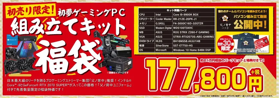 「父ノ背中」推奨! intel Core i9とGeForce RTX 2070 SUPERが入ってこの価格!特典として「2019年父ノ背中ユニフォーム」が付属する早い者勝ちの数量限定販売の組み立てキット福袋です!