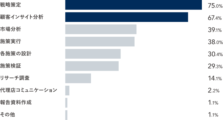 マーケター重要業務は、75%が戦略策定、67.4%が顧客インサイト分析と回答。戦略および顧客インサイト分析を最も重視している。