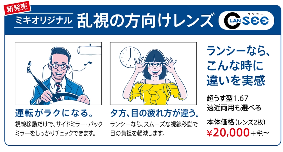 乱視の方の見え方をより快適にする、ミキにしかないオリジナルレンズ「ランシー」が新登場。目の負担を軽減するため、夕方の目の疲れ方が違います。
