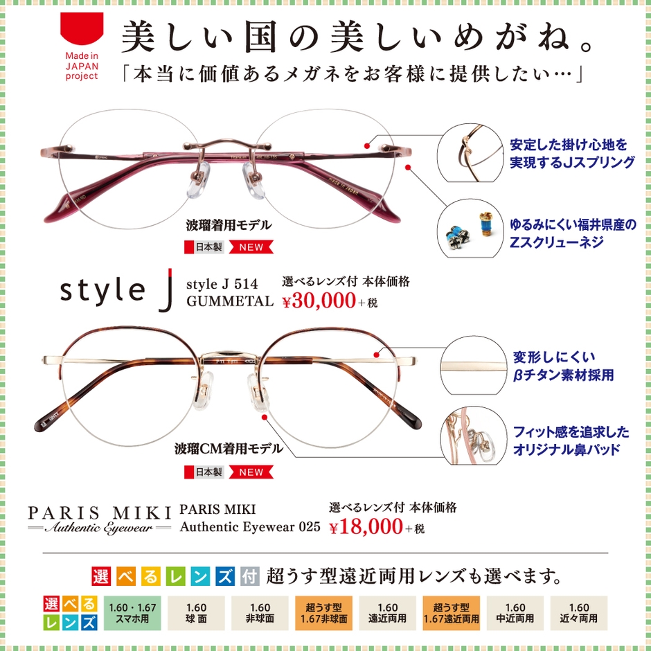 掛け心地、品質にとことんこだわりぬいたミキの日本製フレーム。CMにて波瑠さんが実際に着用している、ミキオリジナルブランドです。