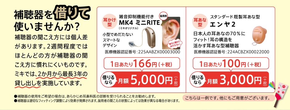 月額¥3,000円+税~ 定額にて補聴器の貸し出しを実施しています。使えるようになるか不安な方もこれなら安心です。