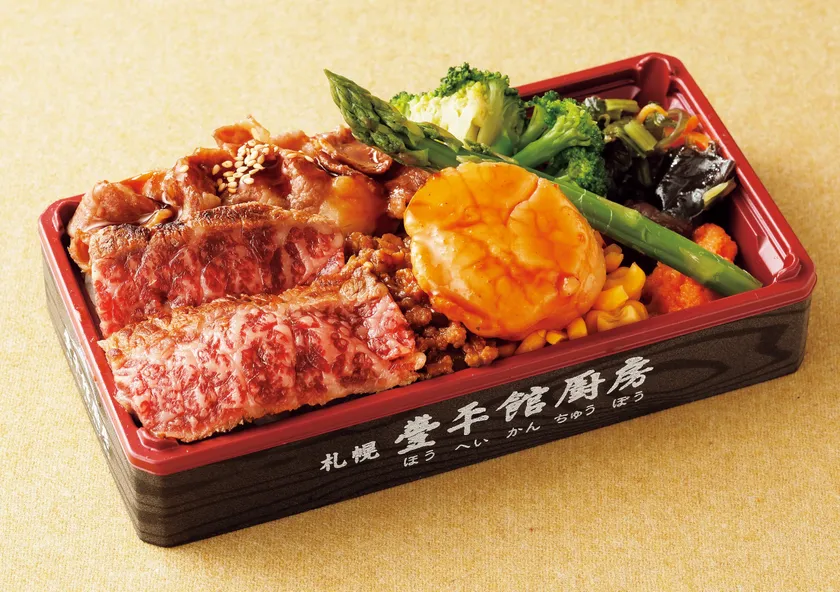 希少部位ステーキやジューシーカルビ、開拓そぼろ、道産明太子、野菜など北海道の食材満喫弁当。