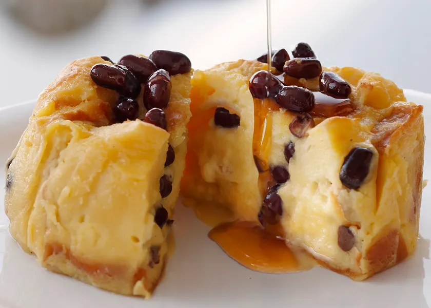 新豆あずきを練り込んだ自家製パンを、焼く前の季節限定「ふらの牛乳プリン チーズ味」に浸して焼きあげました。