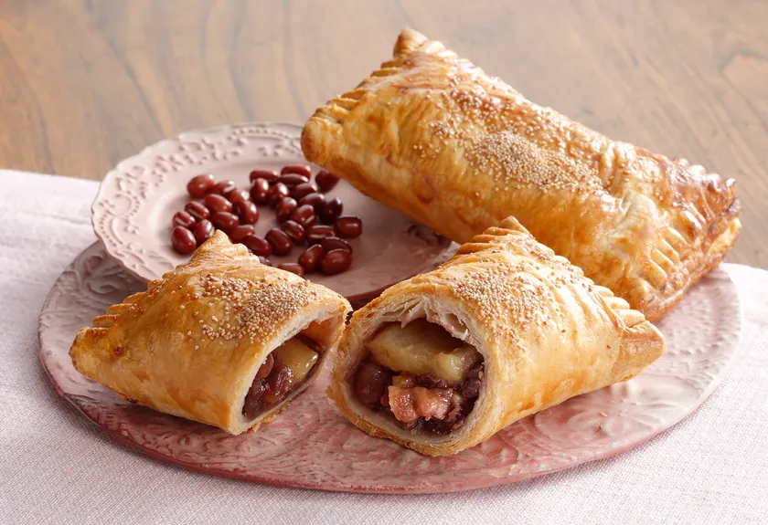 新豆あずきでつくったなめらかなこしあんに、シャキシャキのふじりんごと香ばしいくるみが入った新作アップルパイ。
