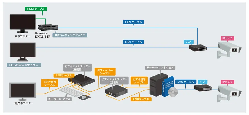 当社は、IPカメラにLANケーブル・ハブを介して直接接続し、ライブ映像をリアルタイムにデコード表示できる機能を備えた「IPモニター」を2014年5月から販売しています。当社のIPモニターを使ったシステムは、PCを必要としないためセットアップが簡単で、機器管理・情報保全の観点からも煩わしさがありません。また、LANケーブル・ハブのみでの接続は、ケーブルマネージメントを容易にし、設置自由度が高くなります。