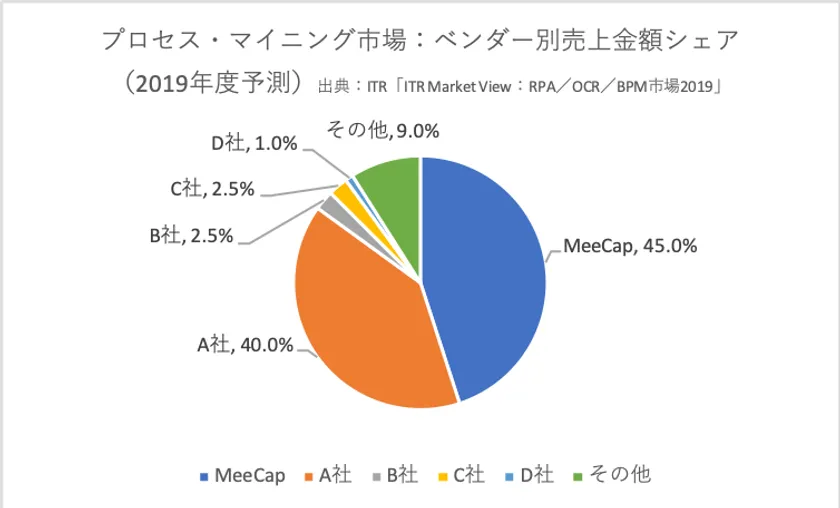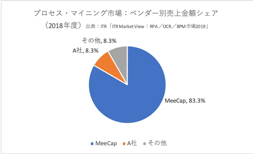 株式会社MeeCap(本社:東京都中央区、代表取締役社長:山田 輝明、以下 MeeCap)は、プロセスマイニングソリューション『MeeCap(R)(ミーキャップ)』について、株式会社アイ・ティ・アール(*1)(以下「ITR」)が調査した、国内プロセス・マイニング市場:ベンダー別売上金額において、2018年度実績、2019年度予測の2年連続市場シェアNo.1(*2)を獲得しました。