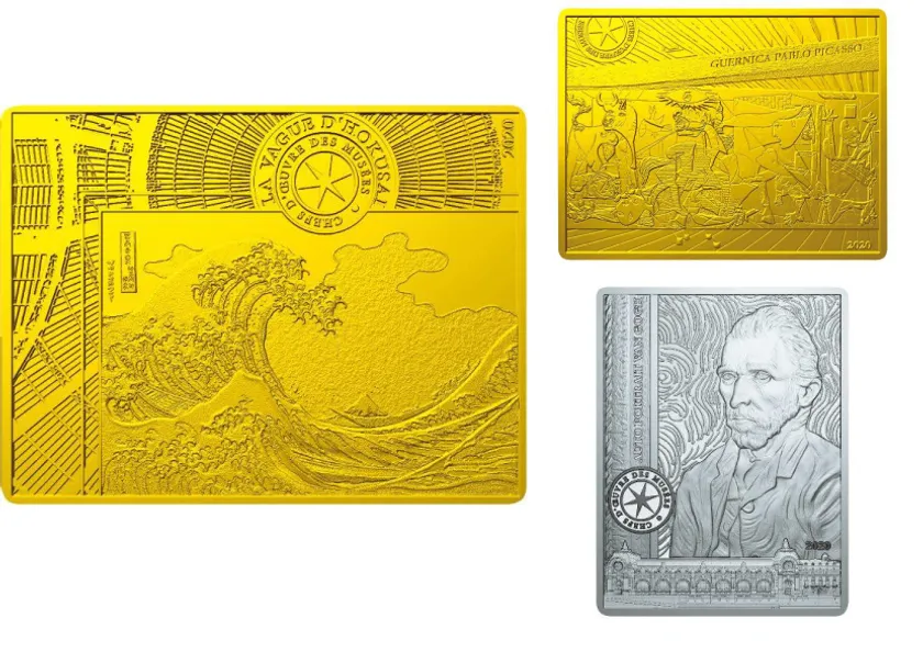 このコインは、世界最古の歴史を有する「フランス国立造幣局」(モネ・ド・パリ)が監修・発行するもので、世界に先駆けて日本で発売されます。北斎の「冨嶽三十六景 神奈川沖浪裏」をはじめ、彼の影響を受けたとされるゴッホやピカソの傑作を、緻密な刻印技術と独創的なデザインで表現しました。