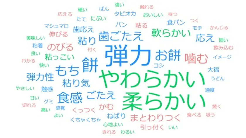 今回の調査は「やわらかい(柔らかい、軟らかい)」や「弾力(弾力性)」、「歯ごたえ(歯応え)」といった言葉が目立つ結果になりました。
