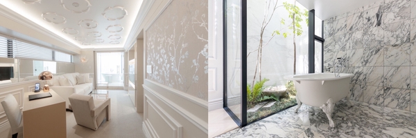 日本の繊細な季節のうつろいを表現した二十四節気から選んだカラーと、Cassina ixc.のインテリアデザインによる個性的な客室。3分の1がバスルームとなっており、大理石の浴室と猫足のバスタブ、バカラのシャンデリア、イタリアのモザイクタイルなど、お部屋ごとに素材とアイテムを変えて、コンパクトながらも贅沢で特別な空間を提供しております。