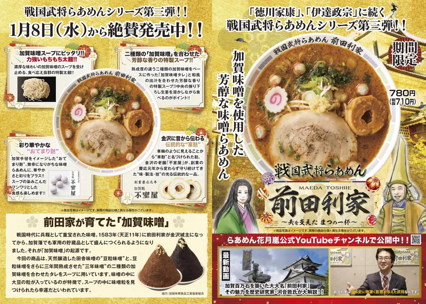 今回登場する一杯は、激動の戦国時代を加賀百万石の大大名にまで上り詰めた武将・前田利家をイメージ。歴史研究家の河合敦氏協力のもと、利家の妻「まつ」が夫を元気づけるために作った一杯という設定にし、前田利家ゆかりの地、加賀の味噌やお麩を用いて作られたオリジナルの味噌ラーメンです。見た目も華やかな、2020年の幕開けに相応しい一杯です。