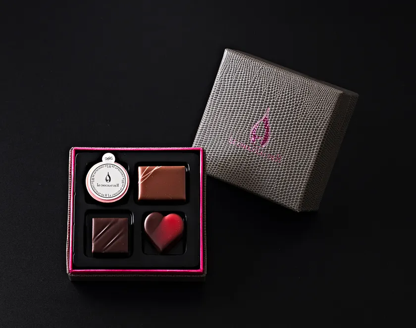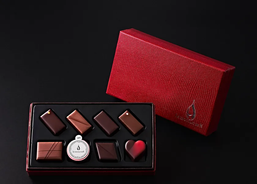 情熱的な赤いパッケージに詰められた8粒。新作Cacao Fleur(カカオ フルール)より「金木犀」と、C.C.C.受賞ショコラ「和のモヒート」、第4のチョコレートと呼ばれるルビーチョコレートの「メダイユ(ルビー)」、ハート型の甘酸っぱいガナッシュ「クール ルージュ」、ヒカリエ セレクション限定フレーバー「エピーヌ」など渋谷ヒカリエ ShinQs店オリジナルのセレクション。