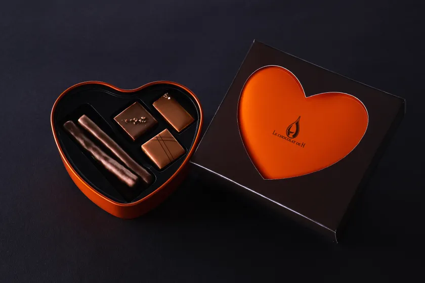 人気のオランジェット7本とプレーンのダークチョコレート、アプリコットガナッシュ、コーヒープラリネのボンボンショコラの3粒をオリジナルのハート缶に詰めた期間限定ショコラ。