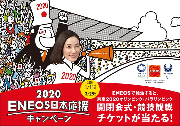 全国のENEOS約13,000SSから日本中に元気と勇気を届けるべく、「2020ENEOS日本応援キャンペーン」を実施します。3月25日(水)までにENEOSのSSをご利用いただいたお客様の中から、抽選で50組100名様をオリンピックとパラリンピックの開会式または閉会式にご招待。また、3,030名様に東京2020オリンピック・パラリンピック実施競技の観戦チケットをプレゼントいたします。