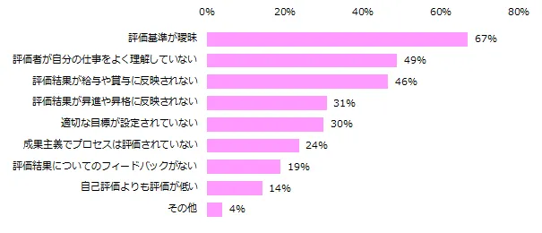 一方、自分の仕事への評価に満足していない方へ理由を伺うと、トップ3は「評価基準が曖昧」(67%)、「評価者が自分の仕事をよく理解していない」(49%)、「評価結果が給与や賞与に反映されない」(46%)でした。