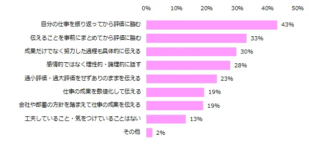 4: 評価を受ける際に気をつけていること、トップ3は「自分の仕事の振り返り」「伝えることをまとめる」「努力の過程を具体的に伝える」。(図7)
