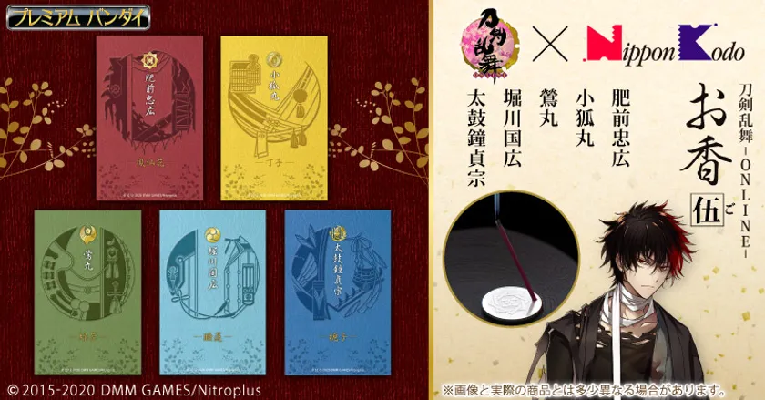 株式会社バンダイ ライフ事業部では、PCブラウザ・スマホアプリゲーム「刀剣乱舞-ONLINE-」に登場する刀剣男士5振りをそれぞれイメージし、創業440年以上の「お香」の老舗ブランド 株式会社日本香堂とコラボしたアイテム第5弾『刀剣乱舞-ONLINE-×日本香堂 お香 肥前忠広/小狐丸/鶯丸/堀川国広/太鼓鐘貞宗』(全5種 各4,400円 税込/送料・手数料別途)の予約受付を、バンダイ公式ショッピングサイト「プレミアムバンダイ」( http://p-bandai.jp/?rt=pr )にて2020年1月10日(金)13時に開始いたします。(発売元:株式会社バンダイ)