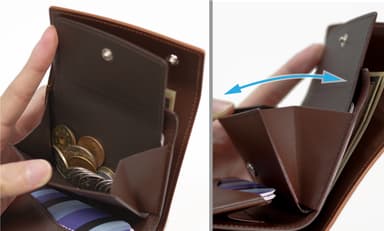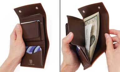 スマホのように縦に持って使う、持ちやすさ・安定性・視認性に優れた折財布です。「現金もまだまだ使う」という方も使いやすいコンパクト財布を目指し開発しました。中身を入れても型崩れしない、ころんとしたフォルム。男性はもちろん、女性にもオススメです。