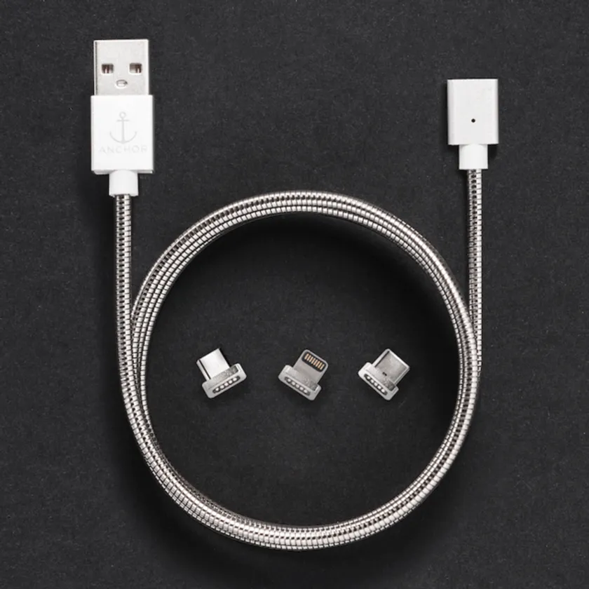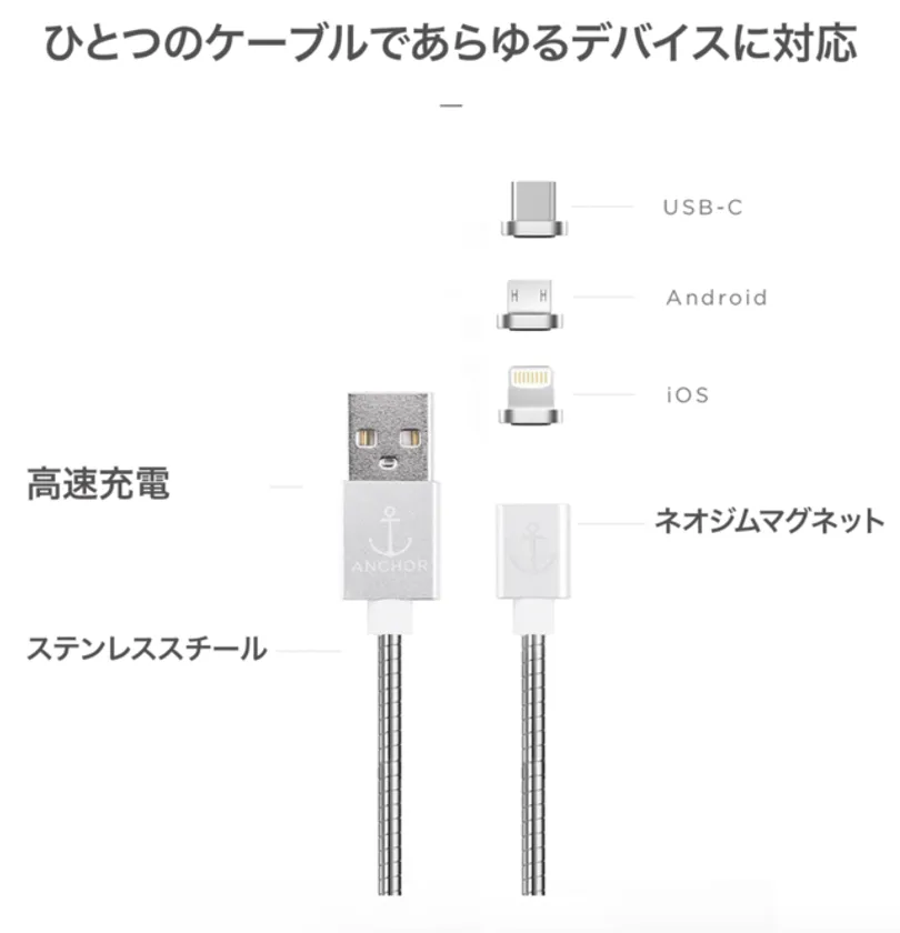 EVERCABLE[M]2.0は、ANCHOR LABORATORIES CO.LONDONが開発したステンレス製の高速充電マグネットケーブルです。ステンレス製ケーブルを使用した特殊な構造によって、約60,000の折り曲げに耐えられる強度を備えています。