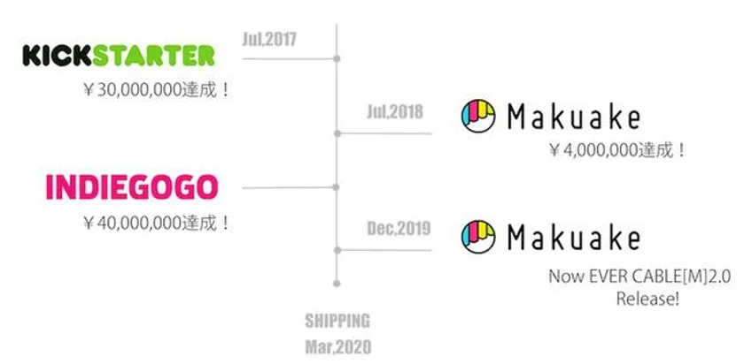 旧モデルの、EVERCABLE[M]は、2017年Kickstarterで開始し、約30,000,000円を集め、2018年にはMakuakeで約4,000,000円、Indiegogoでは約40,000,000円を集めるなど大きな成功を納めました。